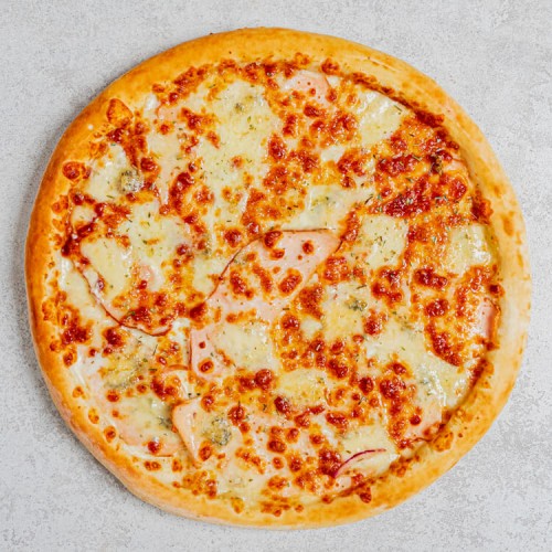 Тісто, соус, сир Український, сир Мацарелла, сир Мармуровий, сир Мисливський, кукурудза, каперси, маслина, перець чилі.